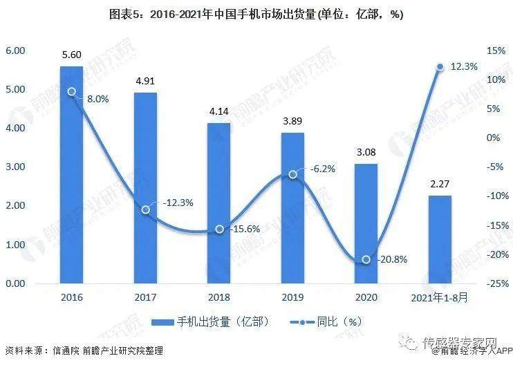 2015-2020年,中国手机市场进入存量状态,但随着5G基础设施的全面推广建设,新一波换机潮正在进行中。2020年中国手机出货量为3.08亿部,同比下降20.82%。2021年1-8月,手机出货量为2.27亿部,同比增长12.3%,增长潜力较大。