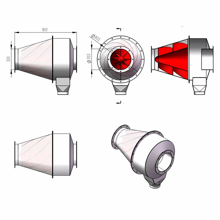 选择重力沉降的话需断面流速控制在3m/s以下,装置筒体直径约11~12m,现场无此安装空间。而旋流式是与管道等径同轴的筒状装置,主要利用筒内放射状排布的倾斜导流叶片,使颗粒具有较高径向运动趋势,并受轴向气流推挤沿筒壁贴附滑动出口端集尘环,气体从出口中心流出,颗粒则落入集尘环底部灰斗。该装置长度较适中,下面我们来详细了解下!