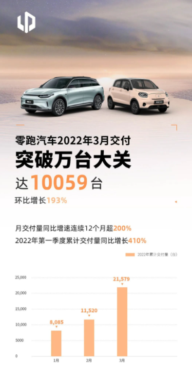 4 月 1 日消息,四月第一天,各大车企开始公布自家最新成绩,零跑汽车 3 月交付超万台大关,达 10059 台,环比增长 193%,月交付量同比增速连续 12 个月超 200%,2022 年第一季度累计交付量同比增长 410%。