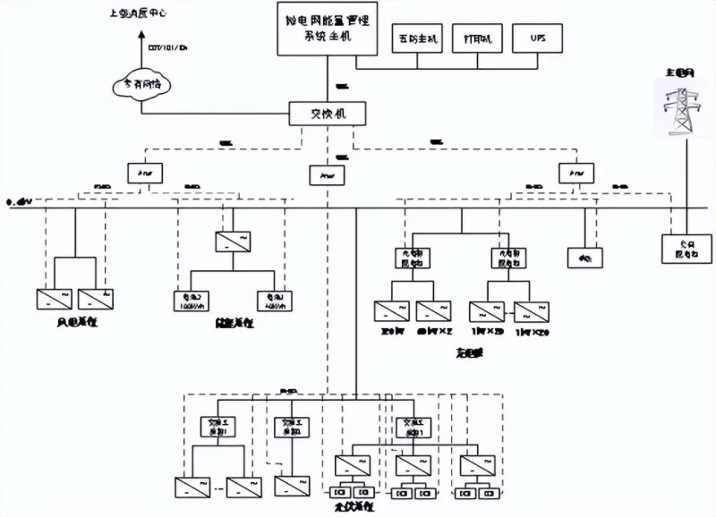 系统通过测控单元与储能装置、电池管理系统(BMS)、汽车充电桩、风机逆变器、光伏逆变器进行实时信息的采集和处理,实时采集模拟量、开关量。