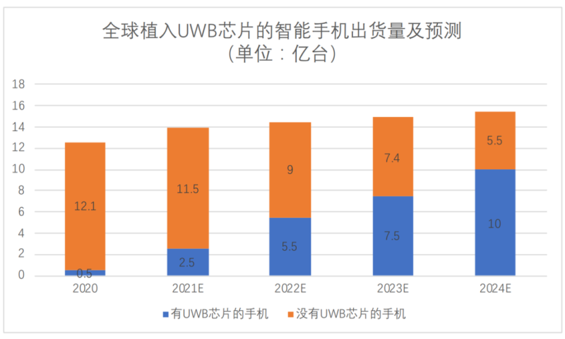 注:全球智能手机数据参考 Canalys,而其中有UWB芯片的出货量数据我们参考了目前市场上主流的智能手机厂商UWB产品的进度以及出货量进行综合评估与预测。