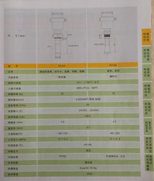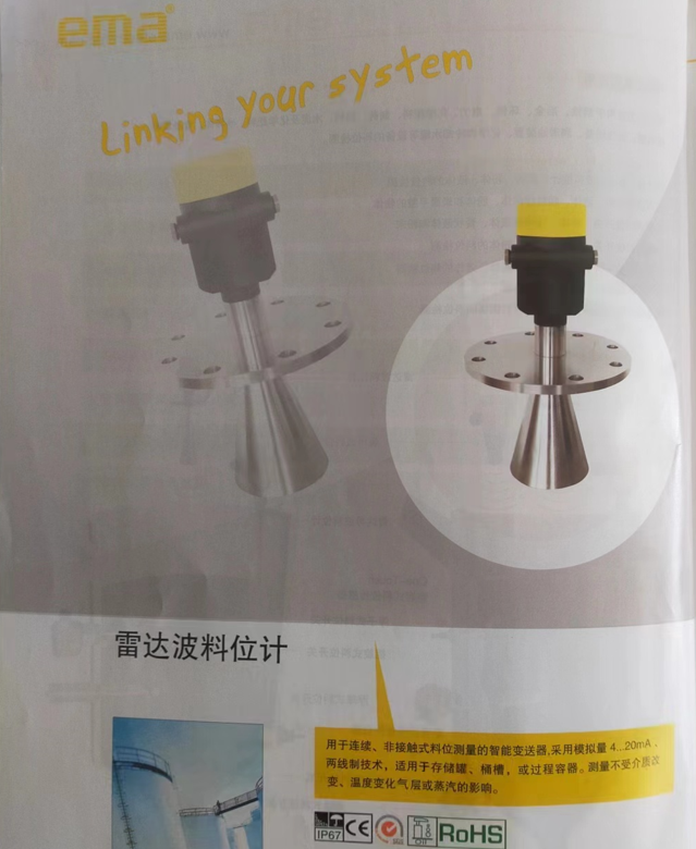 ema伊玛RCSA RCSB RCSC RCSD RCSE雷达物位计安装 应用和选型 EMA伊玛RC雷达物位计分为以上5种型号,1这几款雷达物位计是有区别的RCSA适用于腐蚀性液体,如污水,,,。RCSB适用于液体和浆料,RCSC适用于固体粉料块料,颗粒料,RCSD适用于固体块料,颗粒料,强粉尘环境,RCSE适用于液体,固体块料,颗粒料