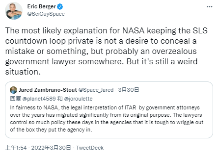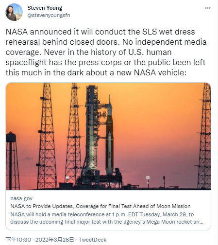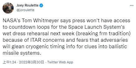 太空记者 Joey Roulette在Twitter上说,NASA探索系统开发部副副主任Tom Whitmeyer表示,媒体无法进入现场观看“湿式彩排”的原因之一是出于国家安全考虑。他提到了对美国《国际军火交易条例》规定的担忧,以及"担心对手会收集低温时间信息,以获得弹道导弹系统的线索",作为不公开倒计时的原因。
