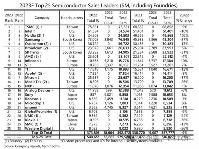 Techinsights,半导体逆向工程和信息提供商发布了负责半导体市场趋势研究的研究McClean Report报告(原ICC Insights,现在已经被Techinsightsits 收购)公布了2023年销售额排名前25位的半导体公司。