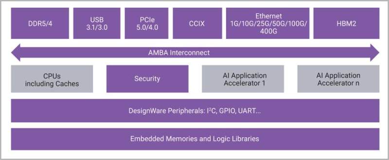 为 CI 和 HCI 系统集成处理器 IP、高级存储器 IP、连接 IP、NVMe 存储以及缓存一致性加速器时,SoC 设计人员需要考虑成本、功耗、性能和开发进度等因素的技术权衡问题。图 3 展示了一个高级 AI 服务器 SoC,其中包含主机处理器、安全算法、系统内存、连接和加速器。