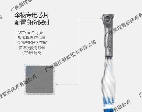 在每把伞的伞柄处加装电子标签,在出厂时,由厂家将生产日期、身份代码和密码数据信息写入标签内,也可自动修改密码。由批发商和零售商持有厂家专制的电子标签读卡机在用户购买伞时,对产品的真伪均可进行验证,实现一机多用。在使用过程中,电子标签不会自行脱落,所以不会出现再次使用的问题。