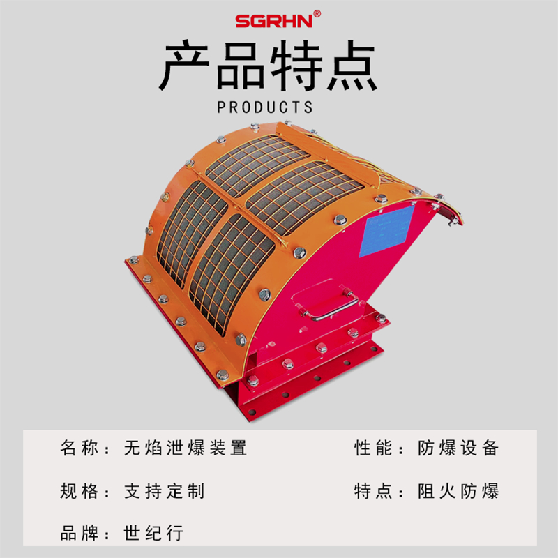无焰泄放装置主要于室内粉尘暴炸的防护,无其他运行成本,安装简便,无需安装泄压导管,是由泄爆装置和阻火元件组成。当设备不能经受爆燃喷发的火球,无法实现管道泄放时,无火焰泄放技术就是被动式保护系统的另一种选择。火焰捕捉,任何火焰都不能逃脱,提供安全的操作环境,消除外部二次点火及其可能引起的连续暴炸对设备的危害性,缓冲暴炸压力峰值保护人员和周围环境,包括建筑物,不受暴炸的压力危害,粉尘带留,捕捉加工物质消除潜在的有害物质,进入环境中。
