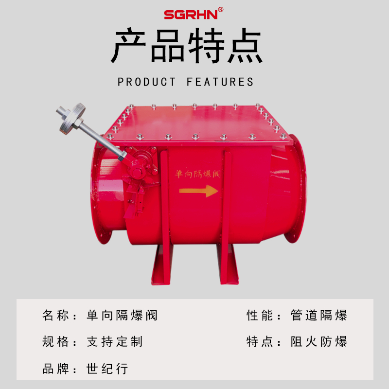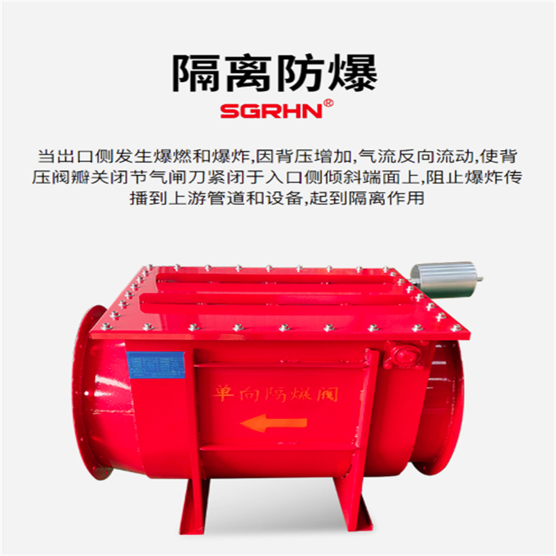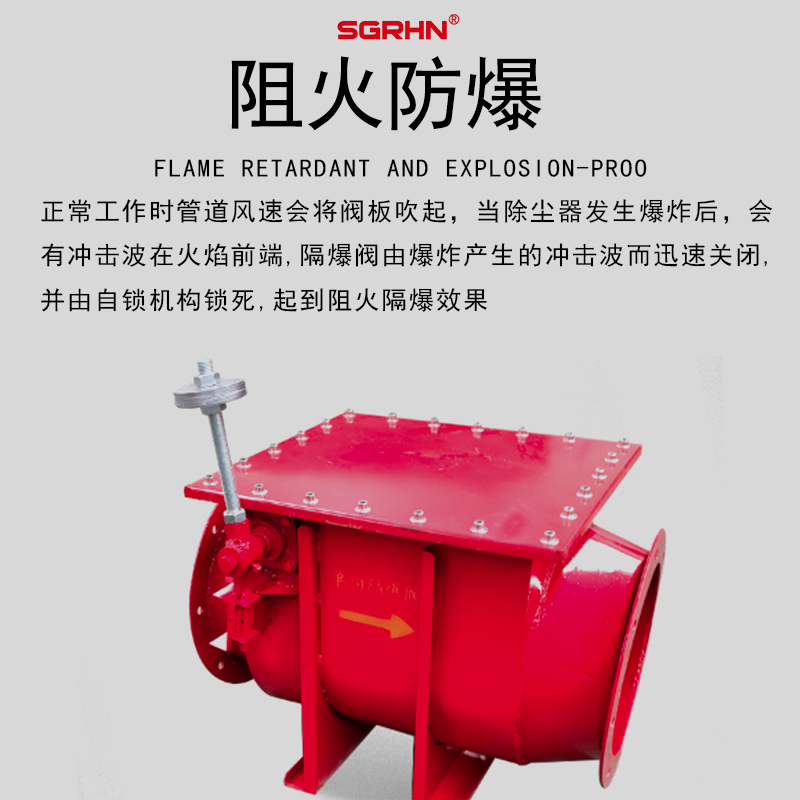 隔爆阀应用在管道上面,可以防止暴炸传播,避免二次暴炸,从而减轻暴炸灾害。降低在生产中不可挽回的损害和损失的风险,隔爆阀因简单、可靠,是安监上要求的隔爆装置。