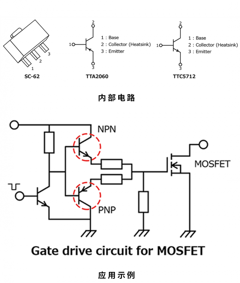 “TTA2060”和“TTC5712”(小型表贴式SC-62包装:东芝别名PW-Mini)它是东芝推出的两种栅极驱动电路、消费设备和工业设备中的电流开关LED驱动电路的双极晶体管。
