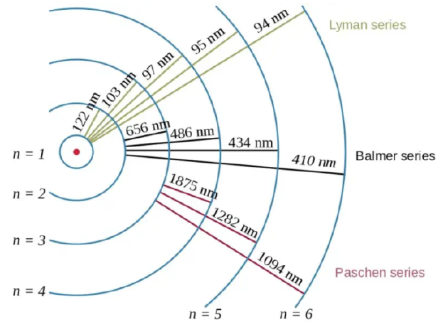 氢原子中的电子跃迁,以及由此产生的光子的波长,展示了量子物理学中结合能的作用以及电子和质子之间的关系。氢原子内电子跃迁能量最高的是莱曼-α跃迁(n=2到n=1),其次是可见的巴尔默-α跃迁(n=3到n=2)。