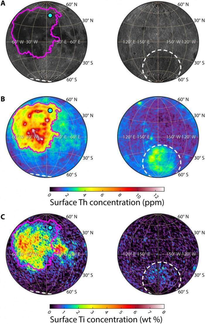 令人震惊的是,这一假说也与另一个难以捉摸的月球区别相吻合。已知月球正面的许多区域含有钾和磷等化学物质,以及钍和其他稀土元素等产热的化学物质。这些元素统称为Procellarum KREEP terrane,或PKT,在月球的背面并不存在。这很奇特。