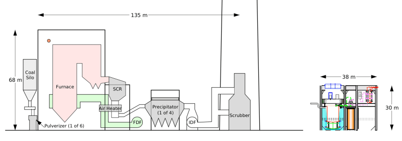 500 兆瓦超临界燃煤电厂的蒸汽发生器部分需要约 45,000 吨钢材用于大型锅炉、煤炭处理、烟气处理和灰处理系统。它使用了大约135,000立方米的钢筋混凝土。几乎所有的燃煤电厂工作都是在现场完成的。