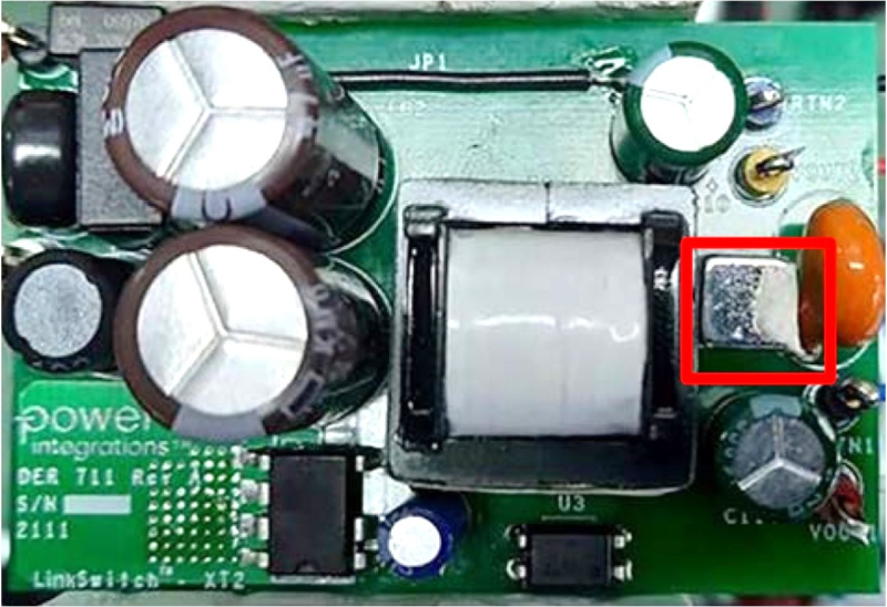 图4. 使用3451高斯磁铁对DER-711 PCB进行测试, 磁铁直接放置在磁芯旁边(红色方框中的银色元件)