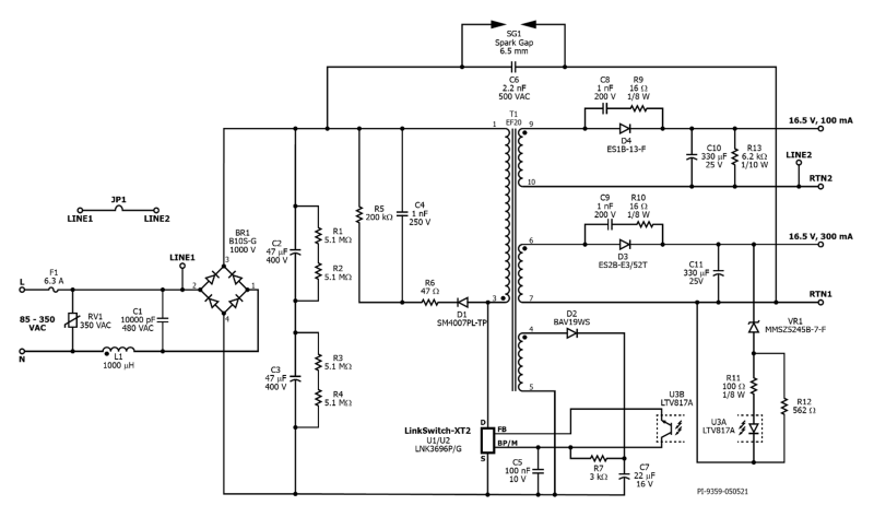 Power Integrations开发了一种防磁干扰、双路输出隔离反激式电源,可在85至350VAC的输入电压范围内提供16.5VDC@300mA和16.5VDC@100mA的输出电流(图1)。其设计要点包括优化变压器以补偿外部磁场的影响, 以及元件的选择和布局。