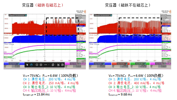 如上所述,当在磁芯附近放置外部磁场时,电感会降低,从而导致开关频率增加。漏极电压的弛张振荡的频率也会随之相应增加。需要使用屏蔽绕组和适当的输入滤波器设计,以控制弛张振铃带来的EMI增大。除EMI 因素外,当磁铁在铁芯上时,启动时间会更长,从9.68ms增加到15.84ms(图5)。
