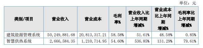 报告期内建筑能源管理系统营业收入增长 51.61%和智慧供热系统营业收入增长 536.85%,主要因在行业发展向好的大趋势下,公司适时加大了营销投入及激励,促成了订单的增长及营业收入的增长。同时,因智慧供热系统尚未形成规模,导致其营业成本变动未随着收入同比例变动。
