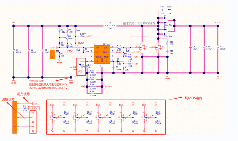 在正常升压恒流电路的基础上增加后端切MOS电路来实现不同颜色之间的切换,同时增加稳压管Z1(小功率板Z1,大功率板Z3)来限制输出电压,稳压管Z1电压选择比灯珠电压高3-4V即可,OVP电压设置比稳压管的电压高3-4V,如下图中标注所示。