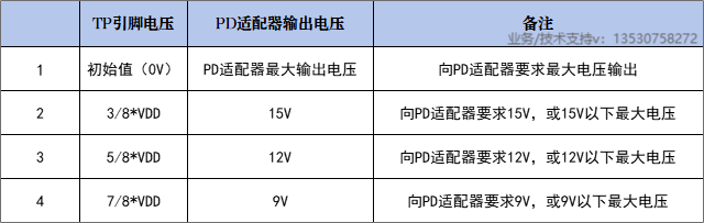 通过调节TP引脚的电压来指定协议输出电压,如下表所示: