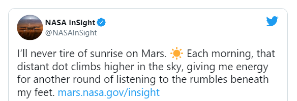 “我永远不会厌倦火星上的日出,”InSight团队本周发推文说。“每天早上,那个遥远的小点在天空中爬得更高,为我提供能量,让我再听一遍脚下的隆隆声。” 一张GIF图显示了4月10日太阳在地平线上移动时发光的球体。