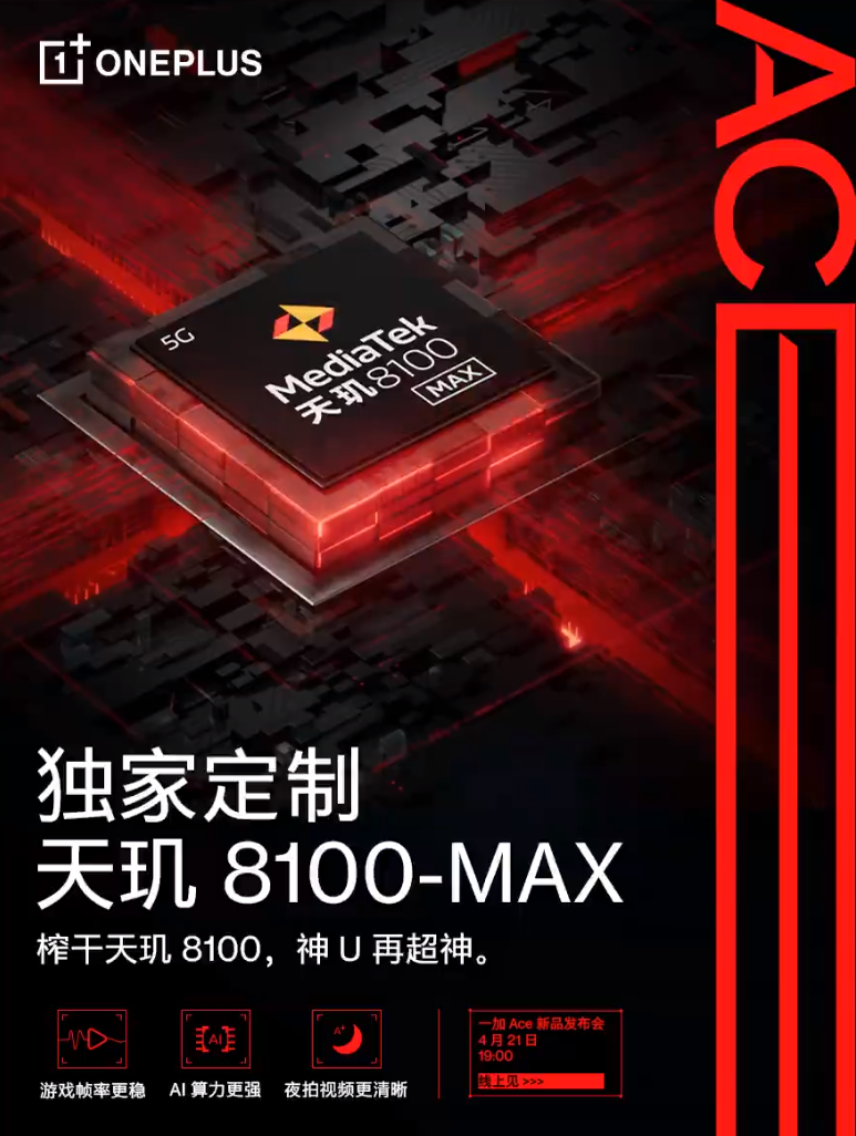 一加今天表示,一加Ace将首发配备天玑8100-MAX芯片,与联发科技合作,独家深度定制,全面优化游戏帧率、AI计算和夜拍视频拍摄。