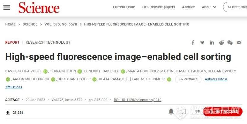 近期,来自美国和欧洲的一项联合研究报道了流式细胞分选技术的一项创新,它将传统流式细胞分选和高速成像结合起来,实现了以极高速度对具有复杂表型的细胞进行单个分选。研究成果发表在《Science》期刊,标题为“High-speed fluorescence image–enabled cell sorting”。