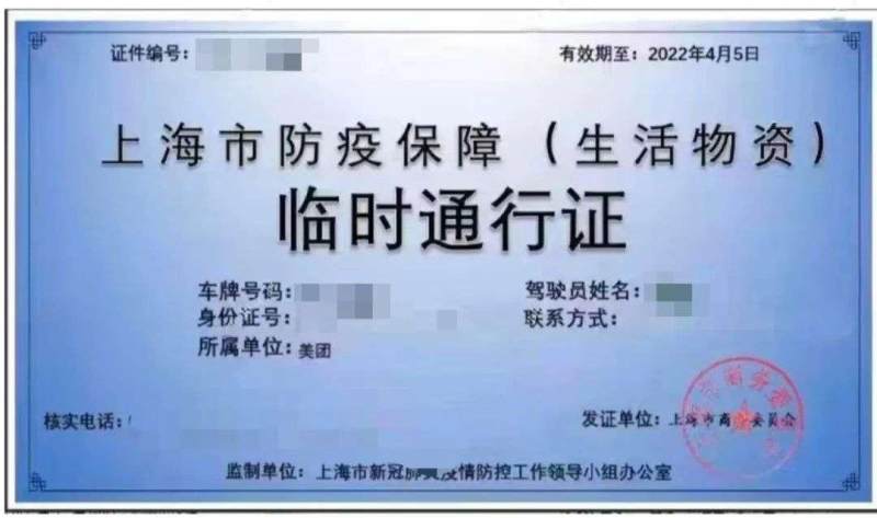 上海市防疫保障(生活物资)临时通行证,药物运输与此证不一样。来源:被访者