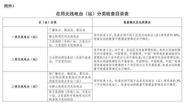 查,根据无线电台(站)的业务功能定位、对其他无线电业务的影响程度以及电磁环境保护要求等不同情况,对在用无线电台(站)实施分类检查,检查频次和比例参见附件3。