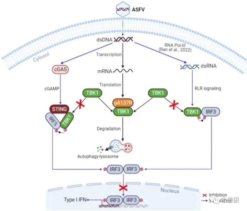 该研究以我国流行的基因Ⅱ型ASFV HLJ/18株(ASFV-WT)为骨架,构建了缺失A137R基因的重组ASFV(ASFV-ΔA137R)。研究团队通过转录组测序分析发现,相较于ASFV-WT,ASFV-ΔA137R感染的原代猪肺泡巨噬细胞诱导更高水平的I型干扰素产生。机制研究表明,A137R蛋白与TBK1存在相互作用,并介导TBK1经由自噬-溶酶体途径降解,进而抑制IRF3的核移位,最终降低I型干扰素的表达。研究团队认为,该研究证实A137R蛋白具有逃逸宿主天然免疫应答的功能,为解析A137R蛋白调控ASFV毒力的分子机制奠定了基础。