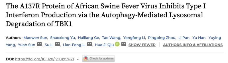 然而,A137R蛋白调控ASFV致病性的分子机制未知。近日,中国农业科学院哈尔滨兽医研究所(下称“哈兽研”)兽医生物技术国家重点实验室猪烈性传染病创新团队在《病毒学杂志(Journal of Virology)》上发表了一项最新研究,他们在解析非洲猪瘟病毒逃逸宿主天然免疫应答的分子机制方面取得新进展。