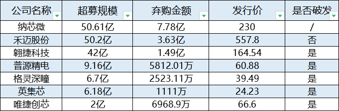 此外,弃购近1.5亿元、上市即破发的翱捷科技,在高定价的帮助下,也完成了超额募资。据悉,翱捷科技原本融资规模是23.8亿元,但是最终的募资规模却高达68.8亿元,募资规模增长了2倍。而去年的史上最贵新股禾迈股份,计划募资5.8亿,结果实际募资额达到55.78亿元,是预期募资的9倍。