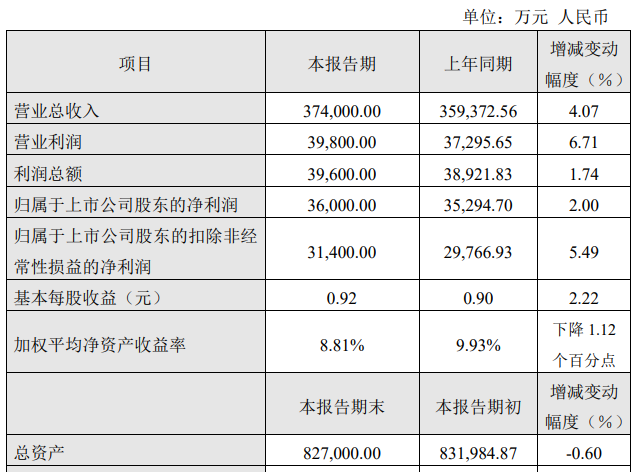 2024年上半年,公司预计营业收入将达到3.74万元,比去年同期增长4.07%。上市公司股东净利润为3.6万元,比去年同期增长2.00%。上市公司股东扣除非经常性损益的净利润为31400万元,比去年同期增长5.49%。