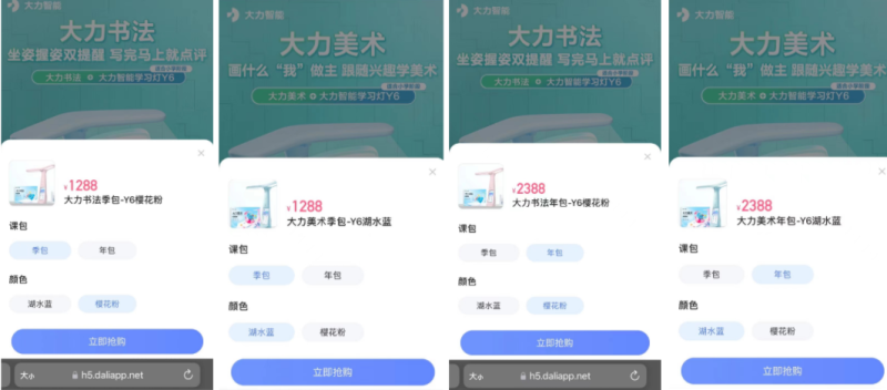 因为之前搜索过“智能台灯”,三年级家长妈妈小安在第二天一早就收到一条相关的推销短信。“点开后,发现是大力书法、大力美术以及大力益智三款产品的购买链接,其中大力书法(季包)、大力美术(季包)及大力益智的售价为1288元,书法与美术的年包则是2388元。”
