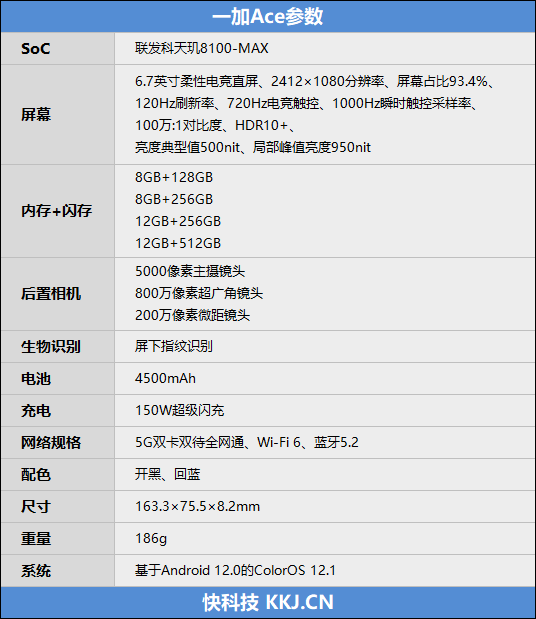 我们快科技就收到了这款回蓝配色、12GB+256GB一加Ace。