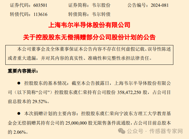 2024年10月11日,韦尔股份发布公告称,公司接到控股股东虞仁荣先生的通知,为支持教育事业发展,支持宁波东方理工大学报批报建,基础设施工程及筹建学校所需要的各项人员、科研和教学资源,并资助宁波东方理工大学教育基金会开展慈善公益活动,虞仁荣先生计划向宁波东方理工大学教育基金会无偿捐赠其持有公司的25,000,000 股无限售条件流通股。