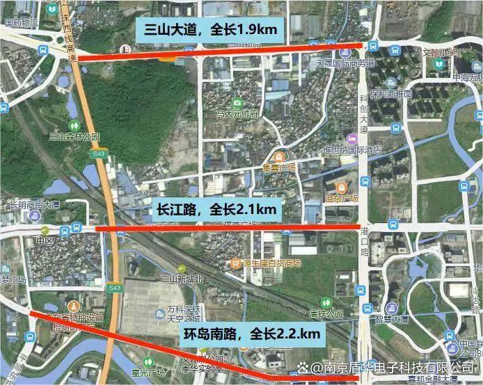 本次照明开通区域为三山大道、长江路和环岛南路三条路段,全长为6.2km,项目内容涵盖了多功能智慧灯杆、智慧公交站、智慧信控系统、智慧设施供配电、智慧设施联网工程等前端及相关配套设施。