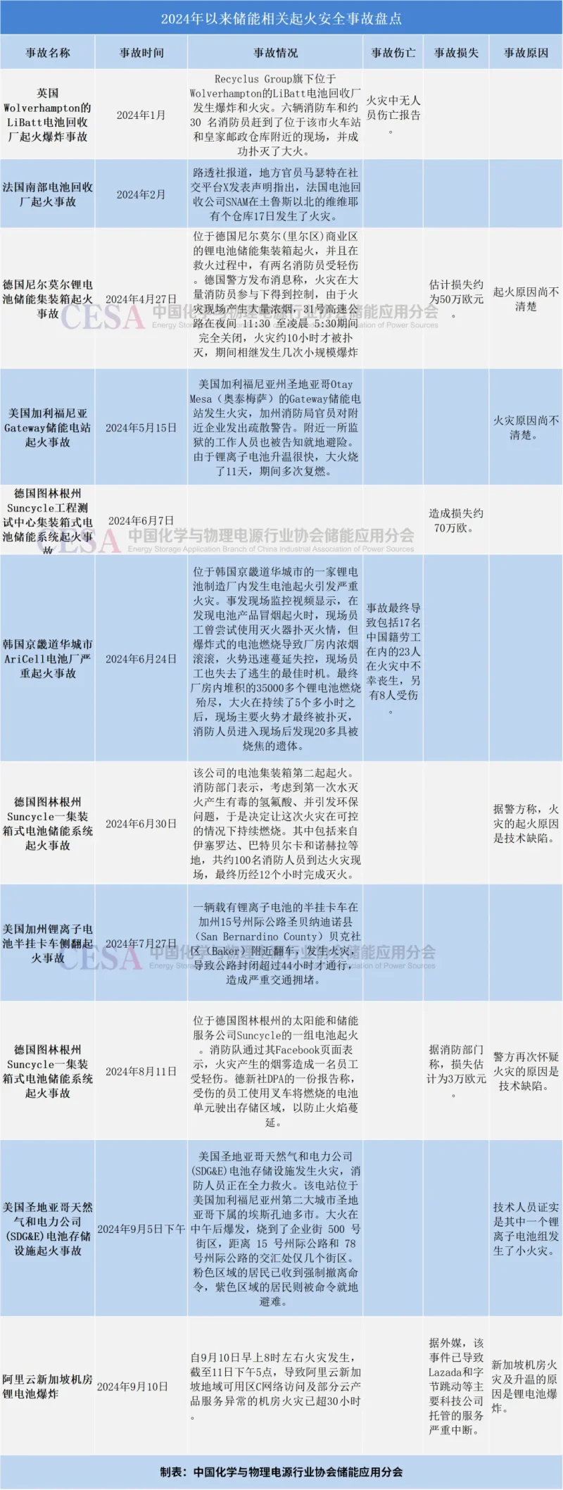 据中国化学与物理电源行业协会储能应用分会统计,截止2024年9月,全球共发生了11起较大的储能相关起火安全事故,多个事故原因指向因技术缺陷引起的锂电池热失控起火。