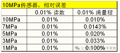 用读数精度更能表示传感器的真实精度,因为满量程精度在不同测量范围下精度误差往往不同,以一个10MPa压力传感器为例,0.01%读数精度即表示在10MPa、7MPa等各量程下精度均为0.01%;0.01%满量程精度则在10MPa满量程下才能达到0.01%的测量精度,在7MPa、5MPa等量程可能精度就只有0.014%、0.02%等,误差放大。