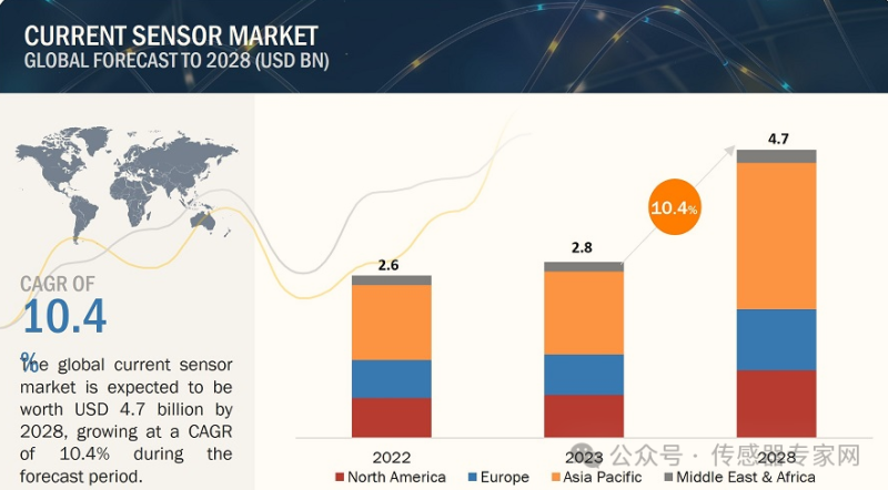 据知名市场机构Markets And Markets 数据显示,2023年全球电流传感器市场规模在 28 亿美元,预计 2028 年将达到 47 亿美元,在 2023 年至 2028 年间预计以 10.4% 的复合年增长率增长。