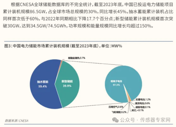 电化学储能在新型储能中占主导地位,据《中国电化学储能产业传感器发展蓝皮书》报告显示,各种传感器主要应用于电化学储能中的电池管理系统 (BMS)、储能变流器 (PCS)、温控系统、消防系统等方面,主要有: