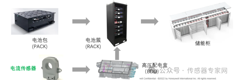 一般来说,电化学储能中,多个电池(Cell)组成一个电池包(Pack),数组电池包组成一个电池簇(Rack),每个电池簇配有高压配电盒(BDU),里面有电池簇控制管理单元( BCU)——BMS系统中的电流传感器就装在这里。