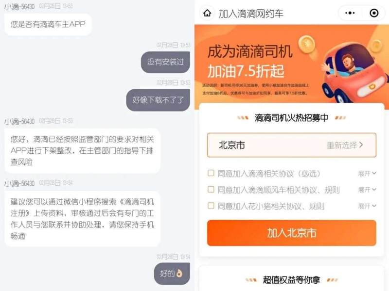 2月28日,燃财经曾向滴滴客服咨询新司机注册问题,在没有下载过“滴滴车主”APP的前提下,客服表示,可以“通过微信小程序搜索《滴滴司机注册》上传资料,审核通过后会有专门的工作人员与您联系并协助处理”。当日,燃财经使用该小程序,也确实可以进行提交资料等程序。