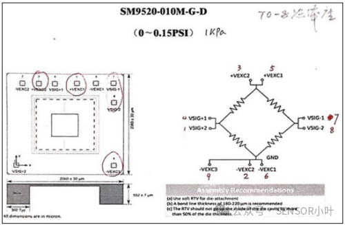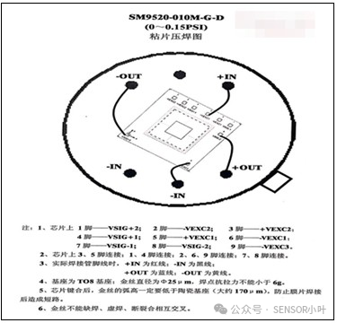我们利用SM95D通过标准生产工艺对其进行粘片、压焊等,最后生产出压力传感器成品(压力芯体),测试其参数性能,测试芯片为SM95系列中1KPa差压型Die,型号为:SM9520-010M-G-D,芯片封装形式如图七,芯片测量压焊如图八。