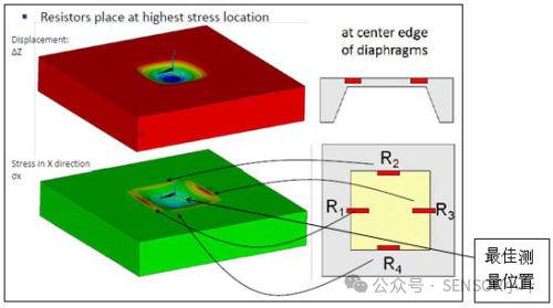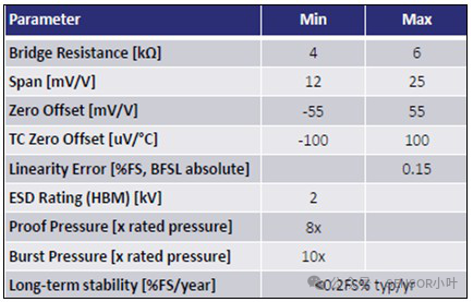 SM95系列采用压阻式压力测量,为全桥式测量方式,如图四,其内部等效方式如图五,这种方式由于采用差分信号计算,有效的避免了压力随温度变化的影响,在压力测量上更加准确,同时采用topside micromachined工艺技术,有效的降低了生产成本,SM95系列的关键参数如图六,其过载压力达到8倍,爆破压力达到10倍,处于行业领先地位。