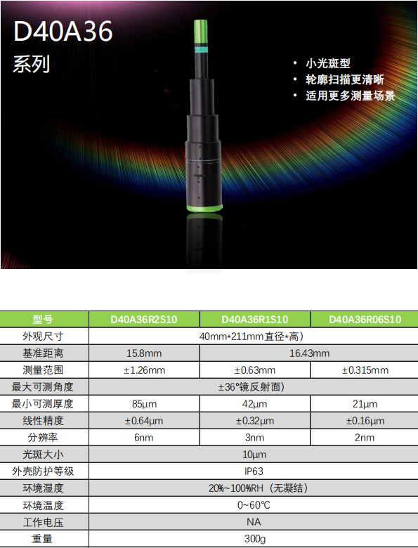 本次测量采用立仪光谱共焦位移传感器G系列搭配D40A36测头,该测头直径40mm,最大测量角度±36°,方便安装,在流水线上进行单边扫描,G系列控制器采用FPGA+CPU硬件架构技术,不仅兼容所有镜头,并且采样频率最高可达到33K,D40A36测头光斑最小10μm,工作距离最大16.43mm,量程2.52mm。