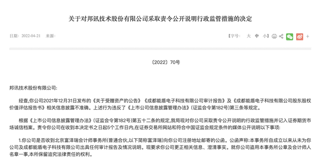 4月22日消息,北京证监局发布《关于对邦讯技术股份有限公司采取责令公开说明行政监管措施的决定》。公告显示,此前为*ST邦讯获赠能盾电子49%股权出具审计报告的富泽瑞会计师事务所表示,从未为*ST邦讯及能盾电子出具任何审计报告及情况说明,并向*ST邦讯就盗用其公章及会计师人名章保留追究法律责任的权利。此外,北京宁邦鸿合资产评估事务所认为ST邦讯存在欺诈骗取评估报告的问题。