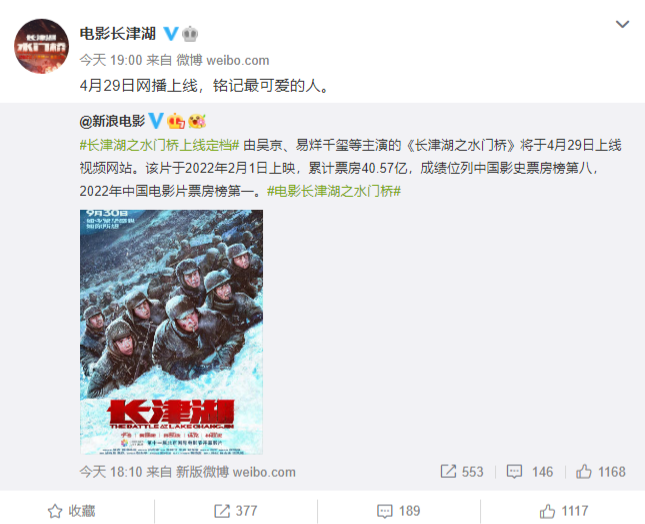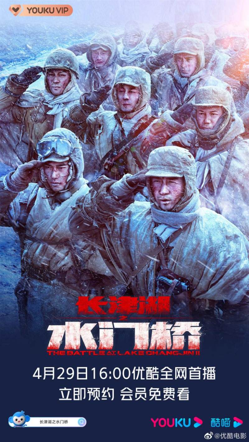 IT之家 4 月 22 日消息,由吴京、易烊千玺等主演的《长津湖之水门桥》将于 4 月 29 日 16 时上线视频网站开启网播。