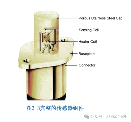 电池组件被一个加热器线圈包围,它可以产生运行所需的700°C。然后,电池和加热器被安装在一个多孔的不锈钢帽内,以过滤较大的颗粒和灰尘,并保护传感器免受机械损伤。图3-3显示了完整的传感器组件。