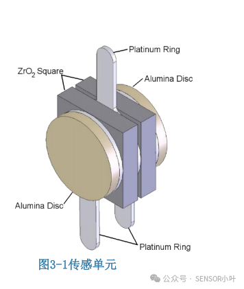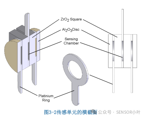 两个二氧化锆正方形被一个铂环隔开,形成一个密封的传感室。在外表面,还有两个铂环,它们和中心铂环一起提供到电池的电连接。两个外部氧化铝(氧化铝)盘进行过滤器,防止任何环境颗粒物进入传感器,并清除任何未燃烧的气体。这可以防止电池的污染,这可能导致不稳定的测量读数。图3-2显示了传感单元的横截面,所有主要组件都被突出显示。