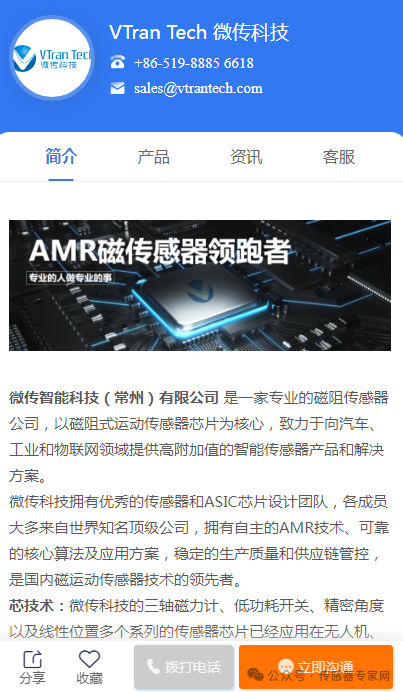 微传智能科技(常州)有限公司 是一家专业的磁阻传感器公司,以磁阻式运动传感器芯片为核心,致力于向汽车、工业和物联网领域提供高附加值的智能传感器产品和解决方案。