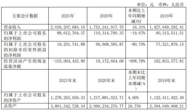 【仪表网 企业财报】4月23日,科林电气(603050.SH)发布2021年年度报告,公司2021年度营业收入20.39亿元,同比增长16.31%;归属于上市公司股东的净利润8861.28万元,同比减少19.67%;归属于上市公司股东的扣除非经常性损益的净利润1920.17万元,同比减少80.79%。基本每股收益0.55元。